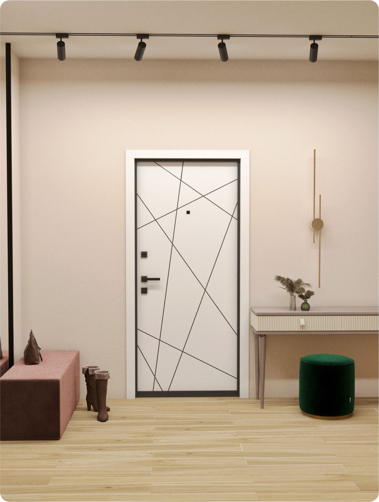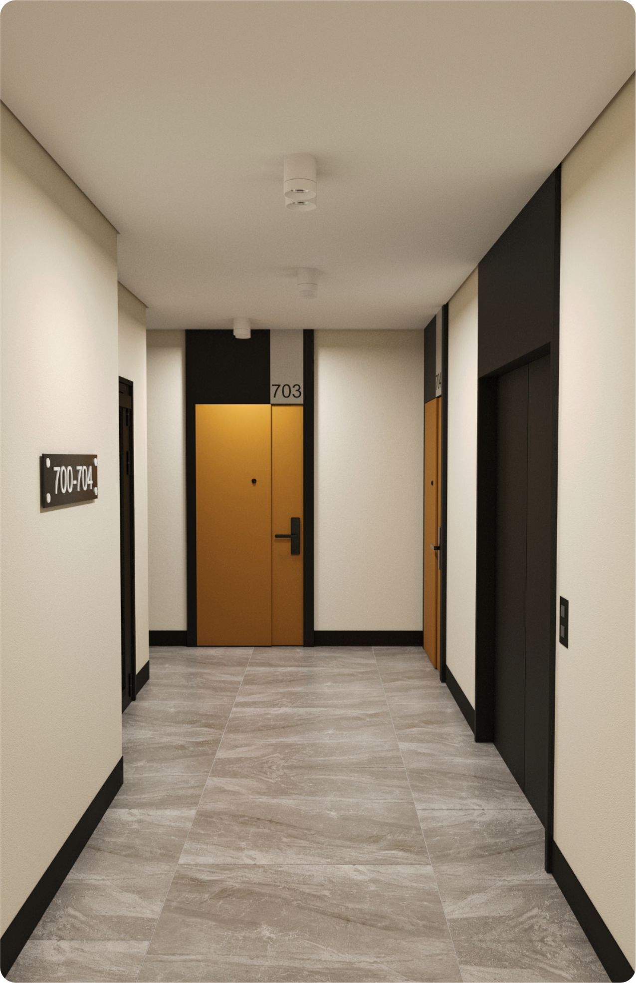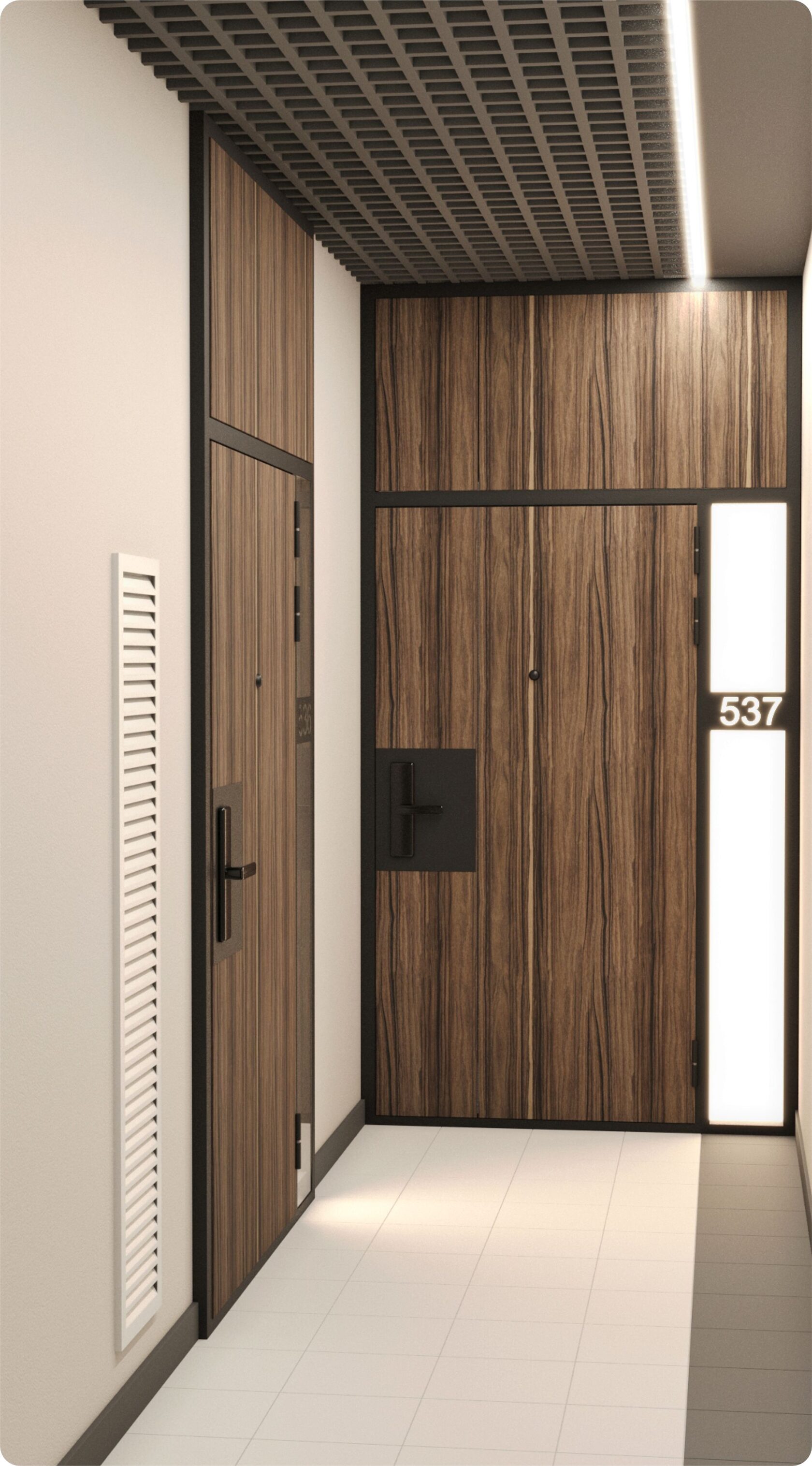 Элементы наружной отделки формируют единую линию мест общего пространства, а индивидуальность жилому помещению придается внутренней отделкой двери.